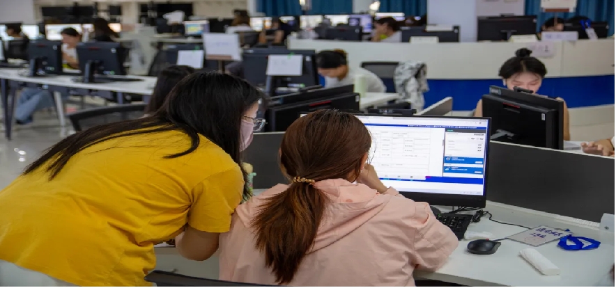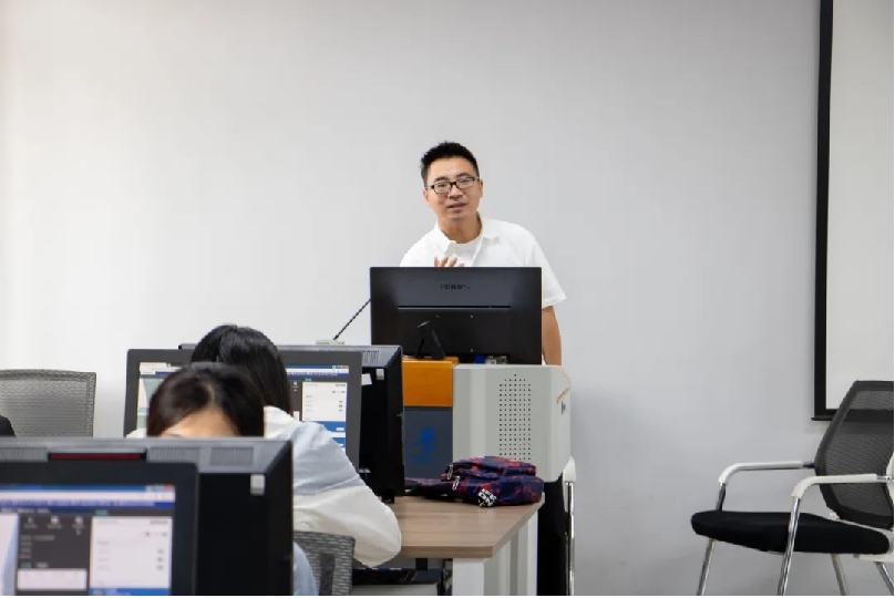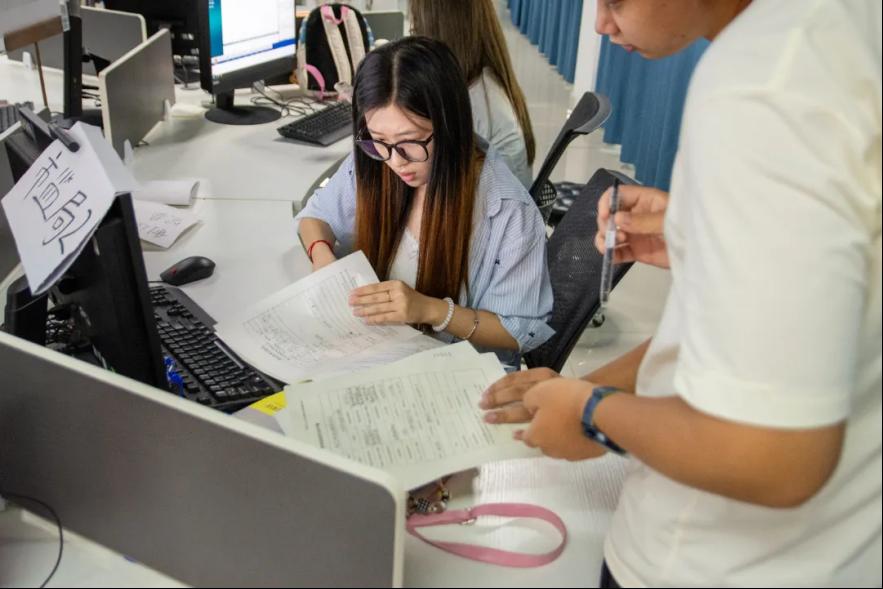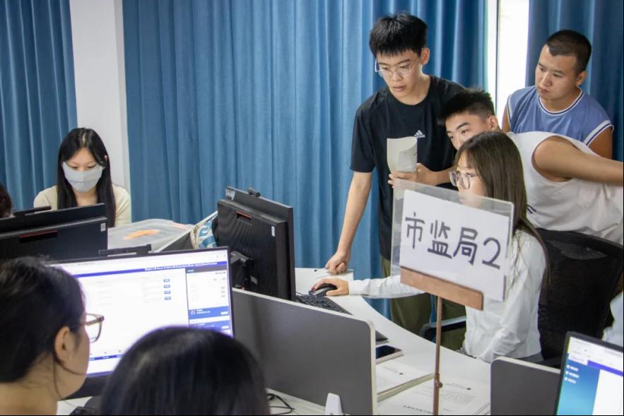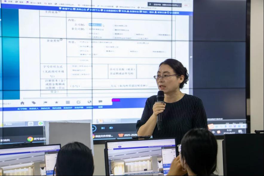 督导老师深入实训现场,一方面对照企业注册、税务登记、银行开户的标准流程,细致核查同学们的操作规范性,及时指出材料填报、流程衔接中可能存在的疏漏;另一方面帮助同学们高效攻克难点,仔细询问老师课程进度。