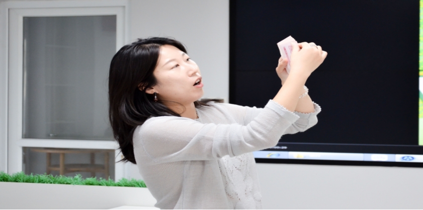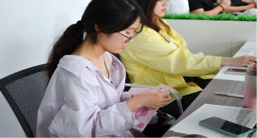 3点10分,画风一转,2302教室变身“点钞训练场”。老师手持练功券,演示点钞技巧,手指翻飞间,钞票清点又快又准,看得同学们直呼“厉害”!随后分教室专项指导,大家拿着练功券反复练习,从一开始的“手忙脚乱”到逐渐找到节奏,教室里满是钞票翻动的“沙沙”声。